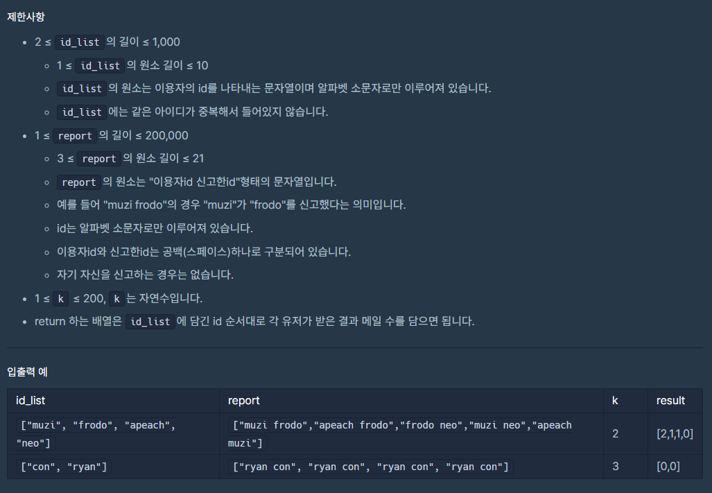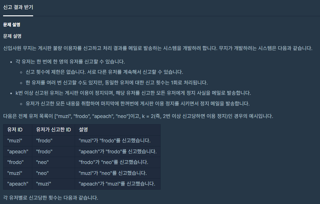 문제 설명 신입사원 무지는 게시판 불량 이용자를 신고하고 처리 결과를 메일로 발송하는 시스템을 개발하려 합니다. 무지가 개발하려는 시스템은 다음과 같습니다. 각 유저는 한 번에 한 명의