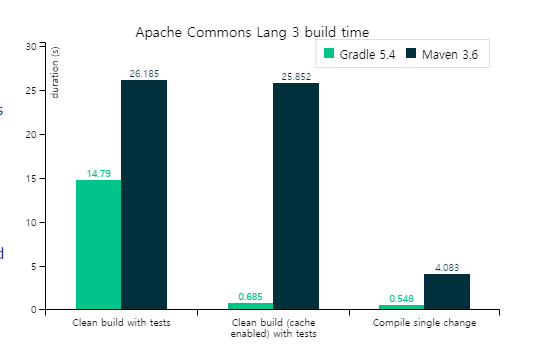 프로젝트가 커지면 자연스럽게 빌드속도가 자연스럽게 늘어나서 생산성에 큰영향을 미칩니다, Gradle은 캐싱 이라고 해서 Gradle에 작성된 dependency를 전부 빌드를 하는 것이 아니라 필요한 dependency만 하거나 아니면 컴파일시에 빌드를 하는등의 설정을 할 수 있어서 Ant와 Maven에 비해 빌드속도가 빠릅니다.