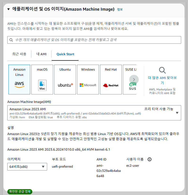 - Quick Start : 인스턴스에서 실행할 OS 선택