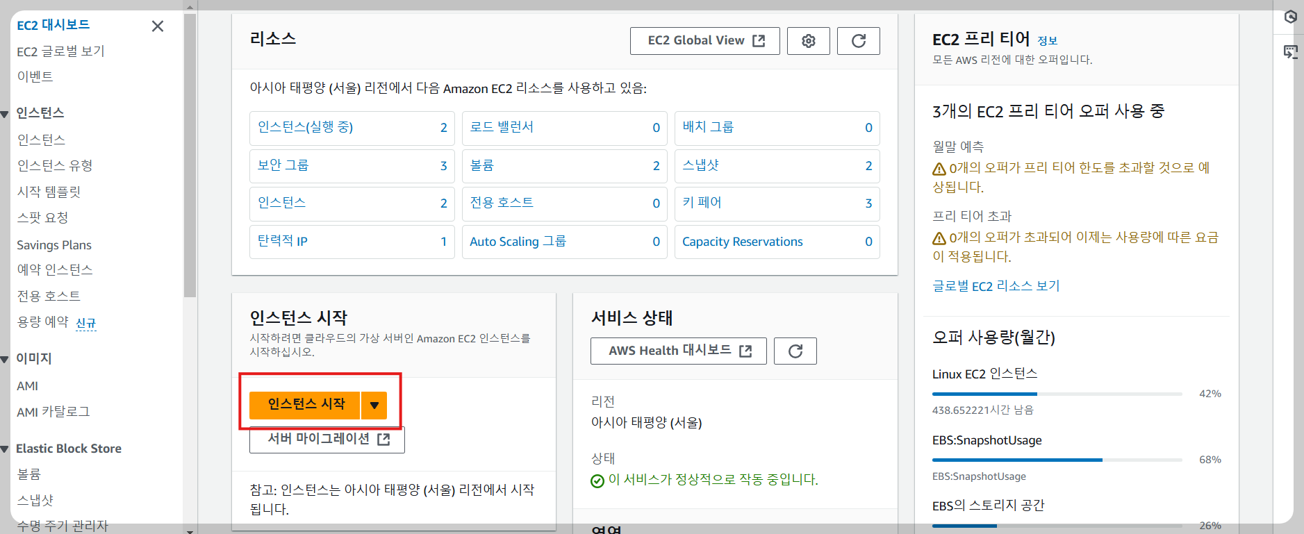1. AWS 상단 메뉴의 검색창에 EC2라고 입력 한 후 EC2에 들어가면 이렇게 메뉴가 나오면 인스턴스 시작 버튼 클릭