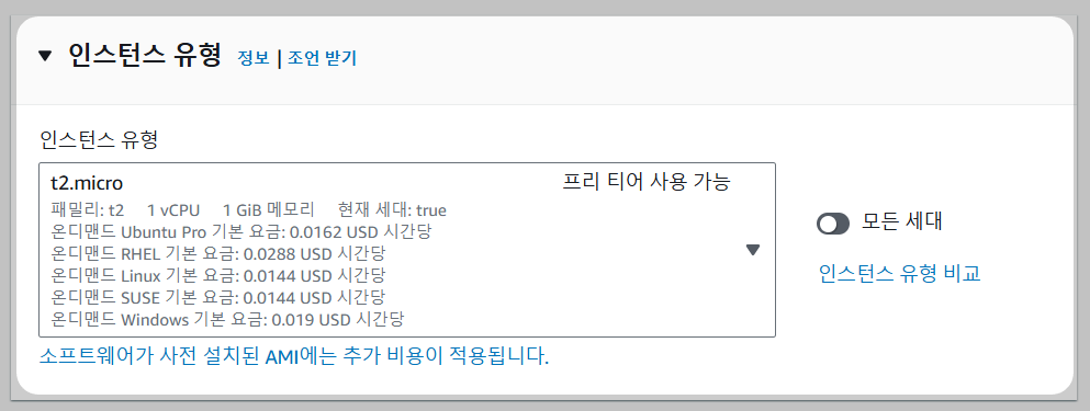 - 인스턴스 유형 : 생성할 인스턴스의 하드웨어 스펙 선택