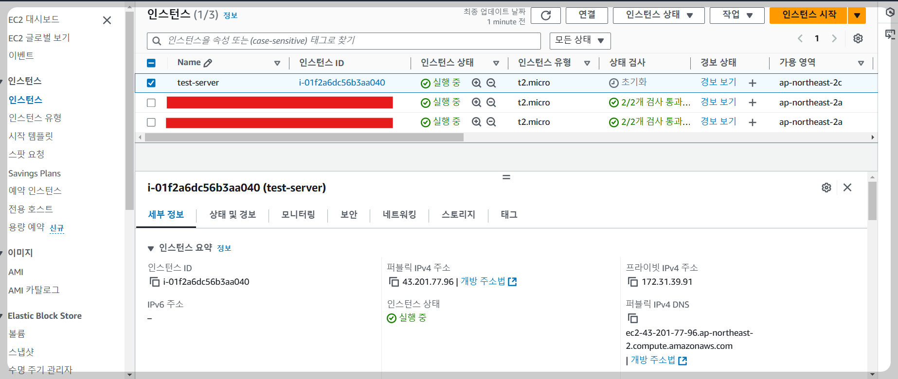 이렇게 실행되고 있는 모습이 보이는데 여기서 퍼블릭 IPv4주소는 인스턴스를 재부팅 할 때마다 새로 지정되는데 만약 새로지정 되는 것이 불만이면 VPC (Virtual Private Cloud) 의 탄력적 IP 메뉴에서 IP를 할당받아 사용해주면 된다.