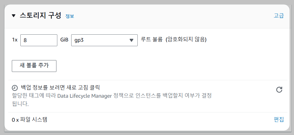 - 스토리지 구성 : 인스턴스의 용량 설정