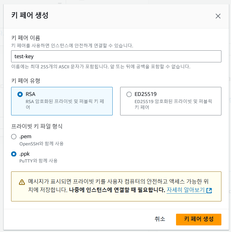 (필자는 ssh접속을 Putty로 해왔기 때문에 .ppk 확장자 키로 선택했다, 키 페어 생성 버튼을 클릭하면 설정한 키가 다운로드가 되는데 키는 잘 간수해야 한다.)