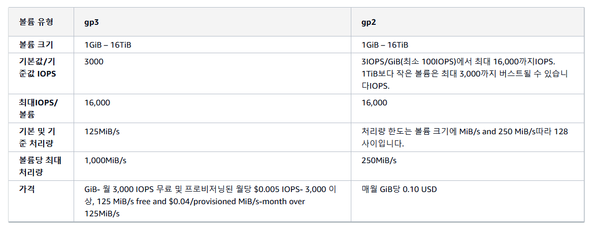 루트 볼륨을 보면 프로시저닝된 SSD를 제외하고 gp2 와 gp3이 있는데 두 개의 차이점이 궁금해서 하단의 표를 넣었다.