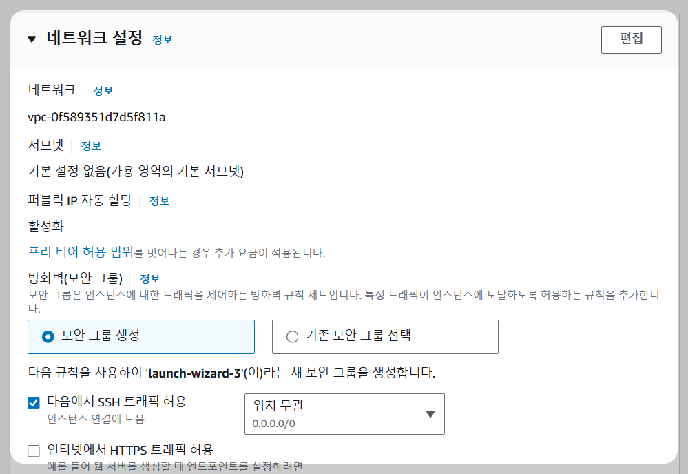 - 네트워크 설정 : 이 항목에서는 보안 그룹 및 SSH로 접근하는 것을 허용할 것 인지 지정