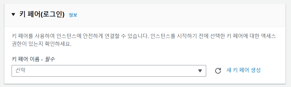- 키 페어 : 인스턴스 내부에 접근할 때 사용하는 인증 키