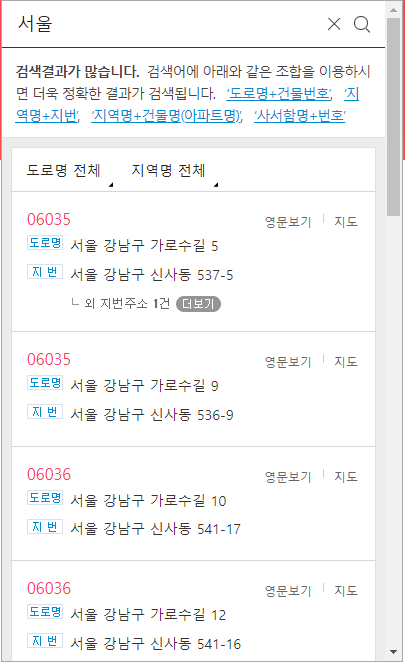 위의 이미지는 많은 사이트에서 사용하고 있는 우편번호 검색 창입니다. 이 창은 특별히 직접 코딩한 것이 아닌 kakao에서 제공하고 있으며 사용법 등 디자인도 변경할 수 있습니다. 소스도 제공하고 있어서 그대로 복사하고 붙여 넣으면 바로 사용이 가능합니다. 또한 기업용, 상업적 용도든 상관없이 무료로 사용이 가능합니다.
