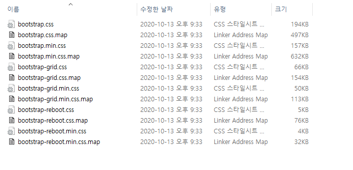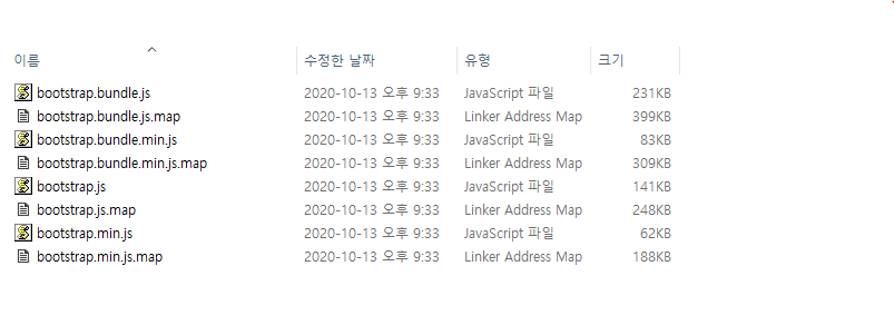 이렇게 나옵니다, 이중에 bootstrap.css 와 bootstrap.js 파일을 지정된 폴더로 복사한 후 link태그의 src부분에 파일을 저장한 링크를 작성하면 Bootstrap기능을 사용할 수 있습니다, 별도로 bootstrap.js 파일을 사용하려면 jquery도 같이 link 시켜야 합니다.